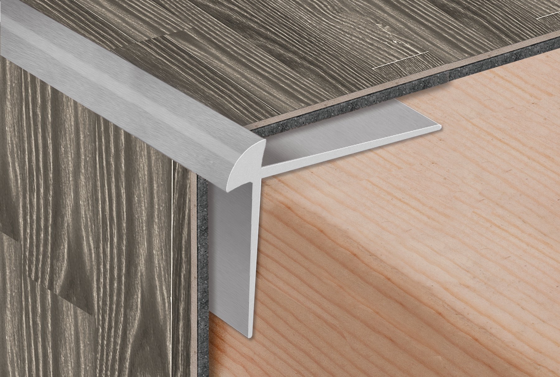 Luxury Vinyl Tile/Luxury Vinyl Plank (LVT/LVP) Outside Corner Square Stair Nosing provides a finishing solution for the outside corner edges of steps with minimal reveal.